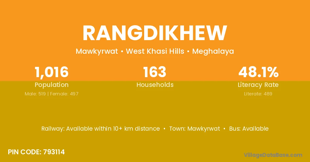 Rangdikhew village has a total population of 1,016 people, of which 519 are males and 497 are females.