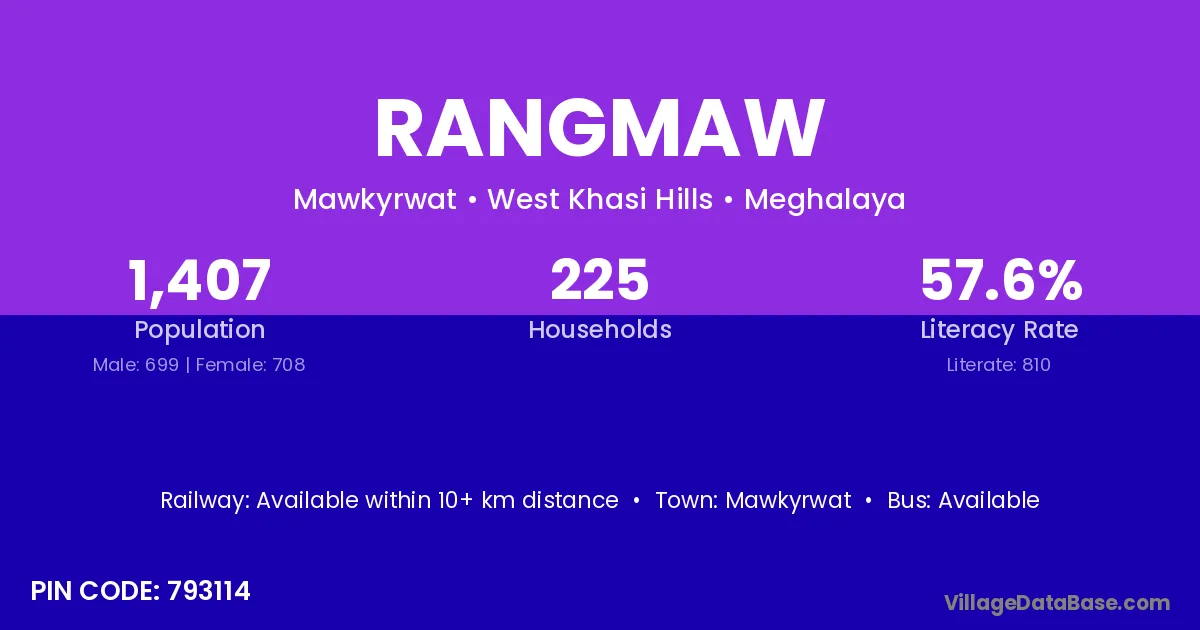 Rangmaw village has a total population of 1,407 people, of which 699 are males and 708 are females.