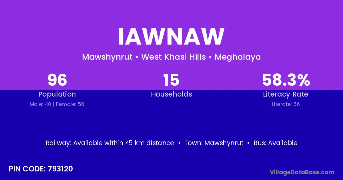Iawnaw village has a total population of 96 people, of which 40 are males and 56 are females.