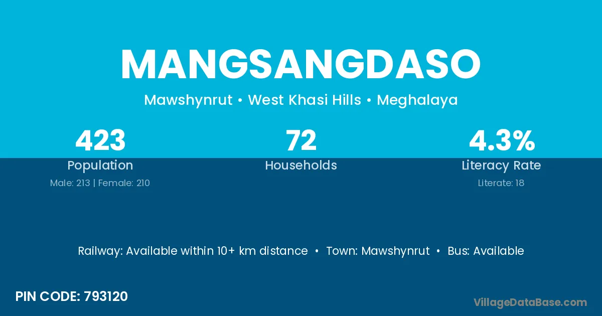 Mangsangdaso village has a total population of 423 people, of which 213 are males and 210 are females.