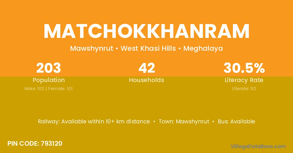 Matchokkhanram village has a total population of 203 people, of which 102 are males and 101 are females.