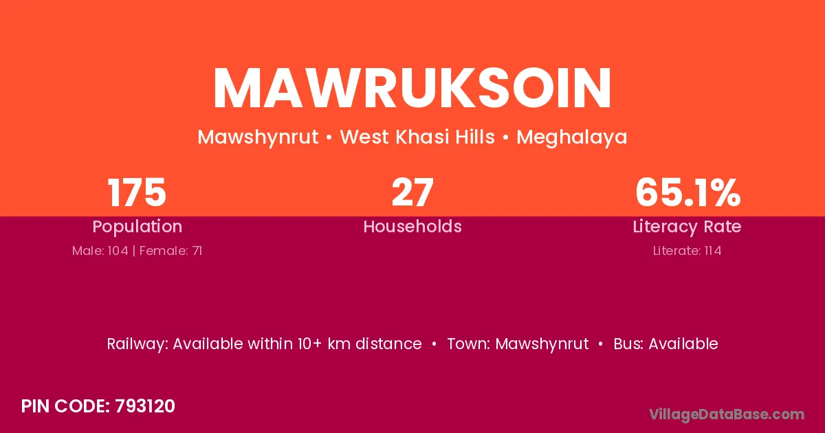 Mawruksoin village has a total population of 175 people, of which 104 are males and 71 are females.