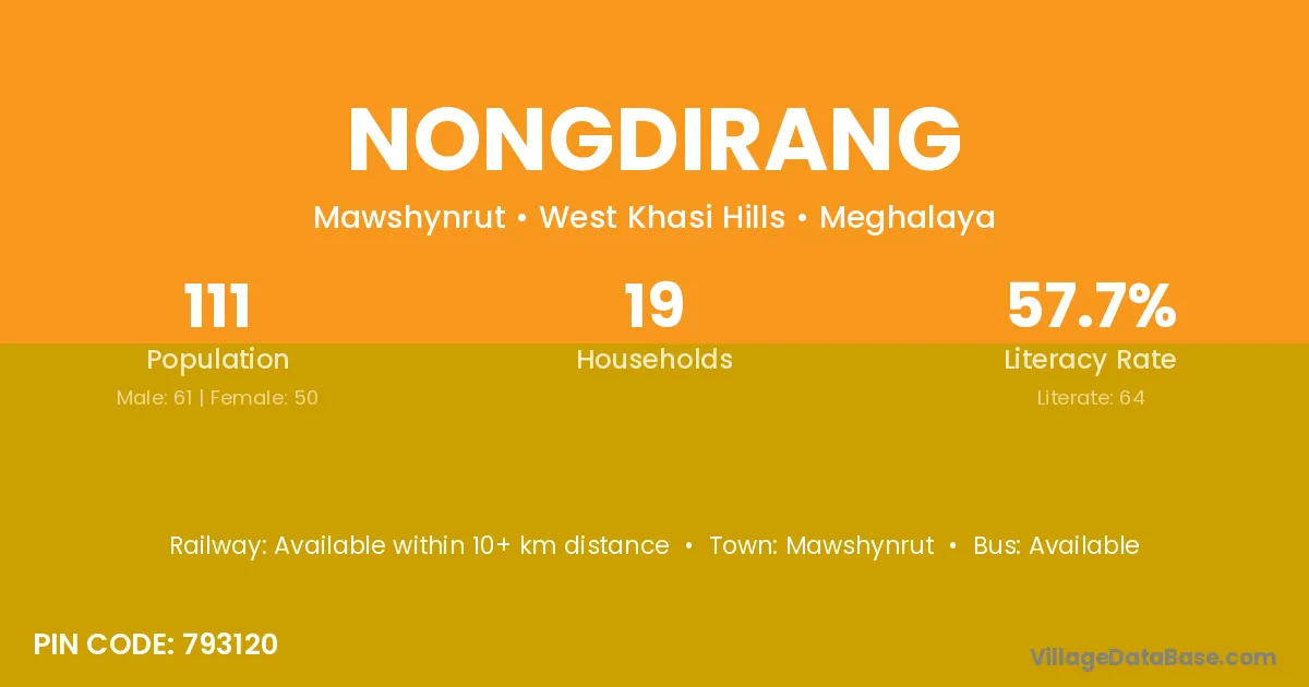 Nongdirang village has a total population of 111 people, of which 61 are males and 50 are females.