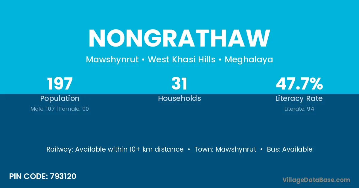 Nongrathaw village has a total population of 197 people, of which 107 are males and 90 are females.