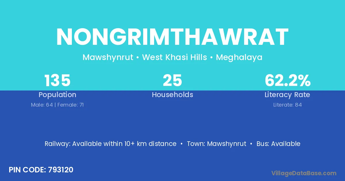Nongrimthawrat village has a total population of 135 people, of which 64 are males and 71 are females.