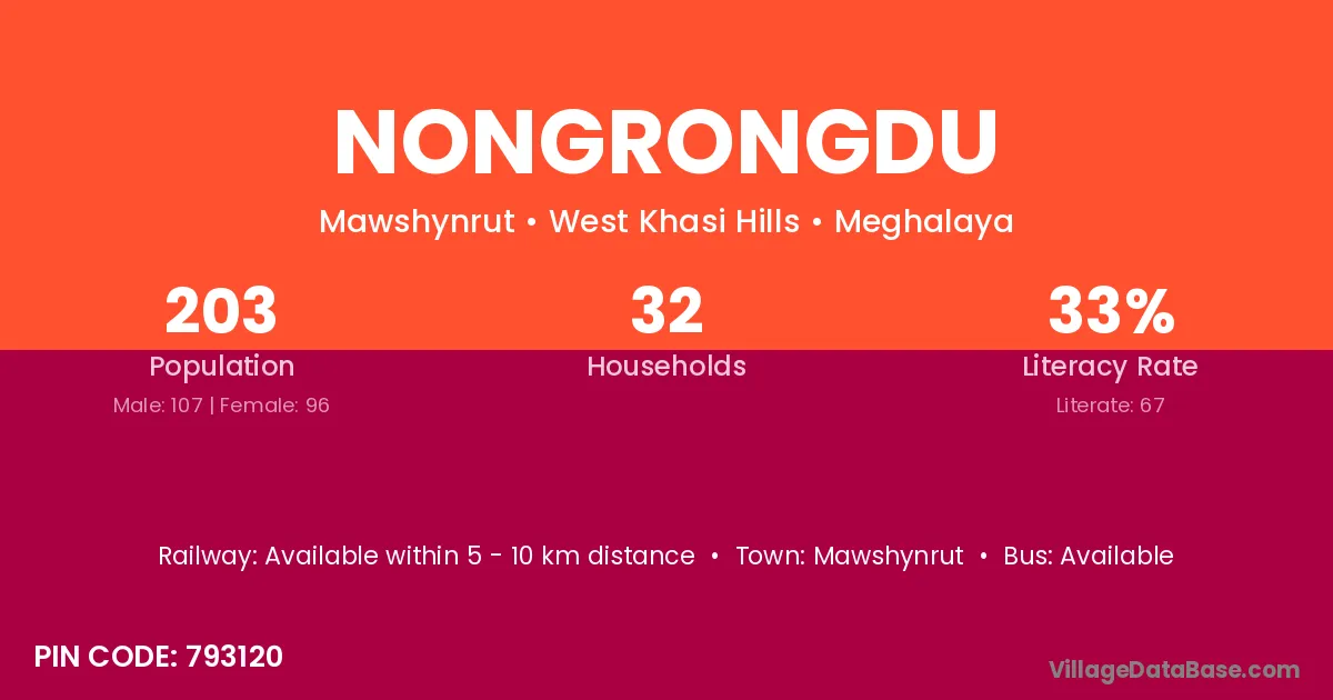 Nongrongdu village has a total population of 203 people, of which 107 are males and 96 are females.
