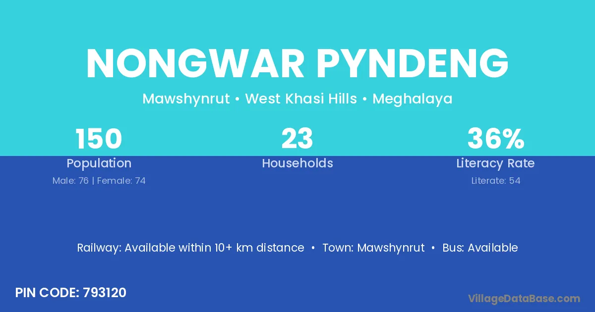 Nongwar Pyndeng village has a total population of 150 people, of which 76 are males and 74 are females.