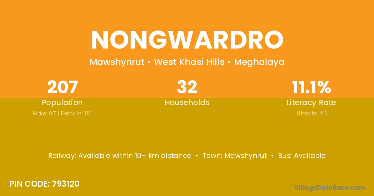 Nongwardro village has a total population of 207 people, of which 97 are males and 110 are females.