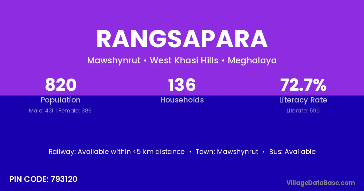 Rangsapara village has a total population of 820 people, of which 431 are males and 389 are females.