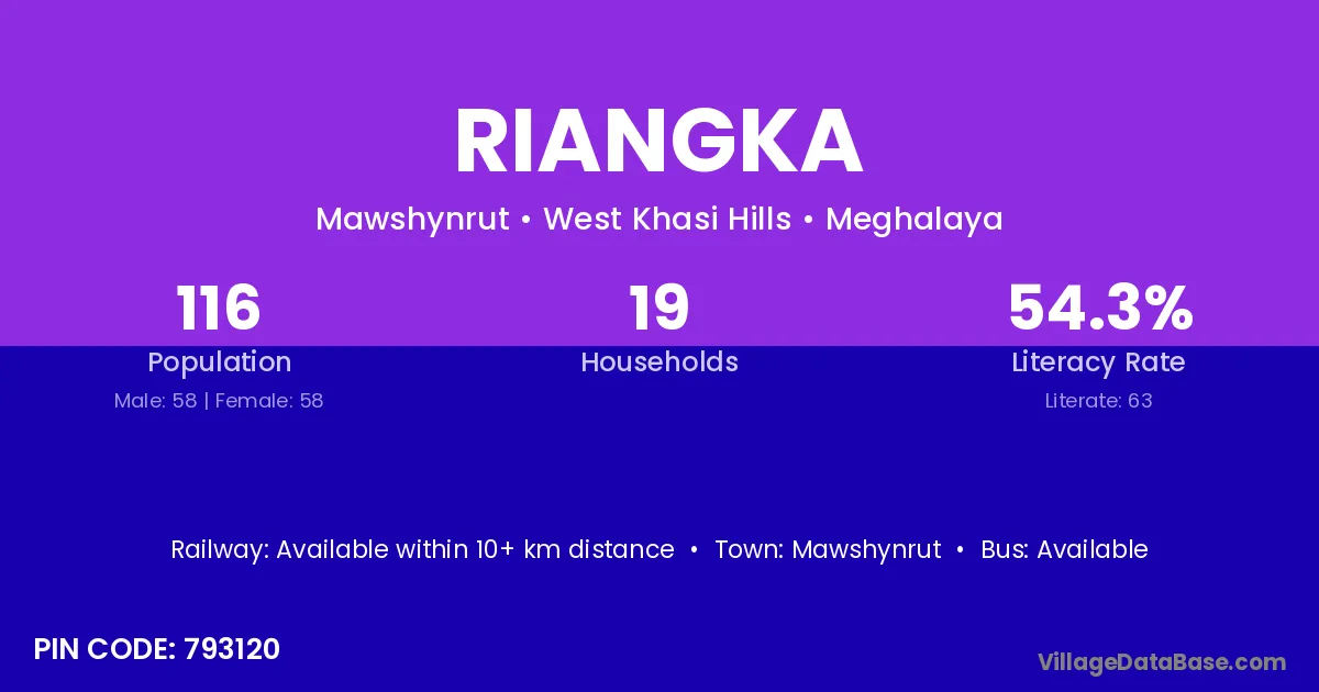 Riangka village has a total population of 116 people, of which 58 are males and 58 are females.