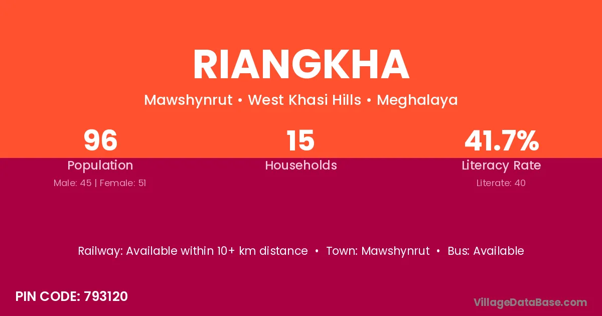 Riangkha village has a total population of 96 people, of which 45 are males and 51 are females.