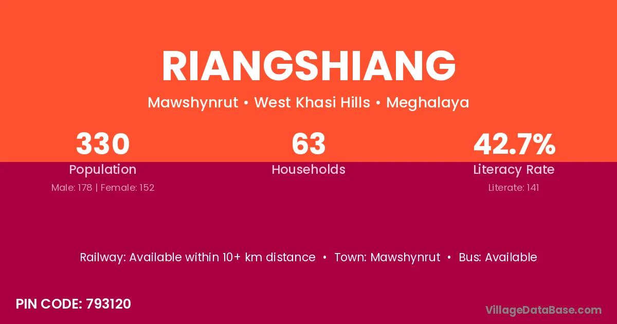 Riangshiang village has a total population of 330 people, of which 178 are males and 152 are females.