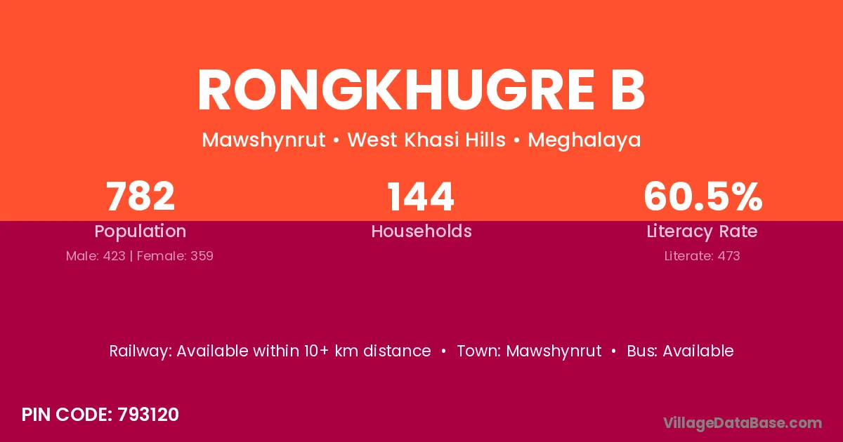 Rongkhugre B village has a total population of 782 people, of which 423 are males and 359 are females.