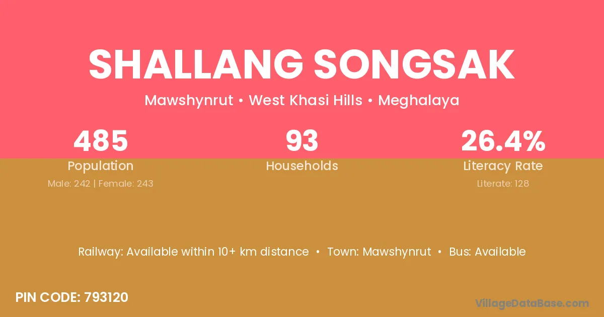 Shallang Songsak village has a total population of 485 people, of which 242 are males and 243 are females.