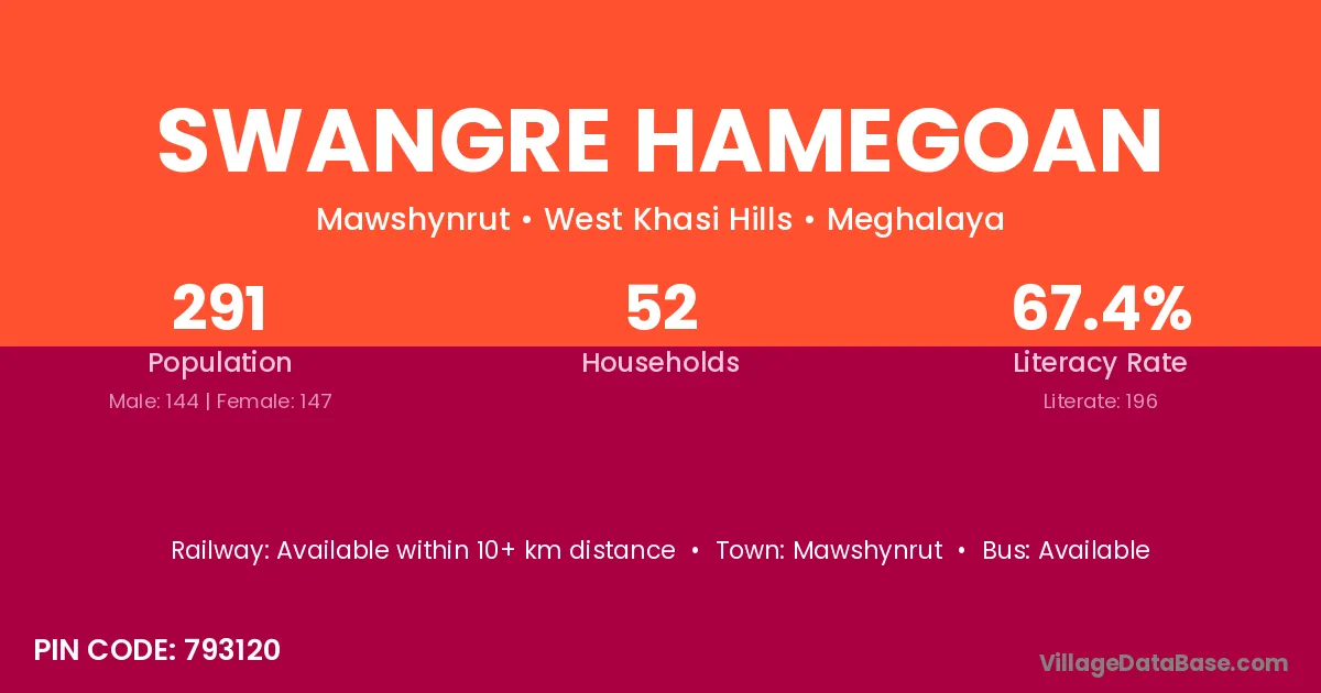 According to Census 2011 information, the village code of Swangre Hamegoan village is 793120.