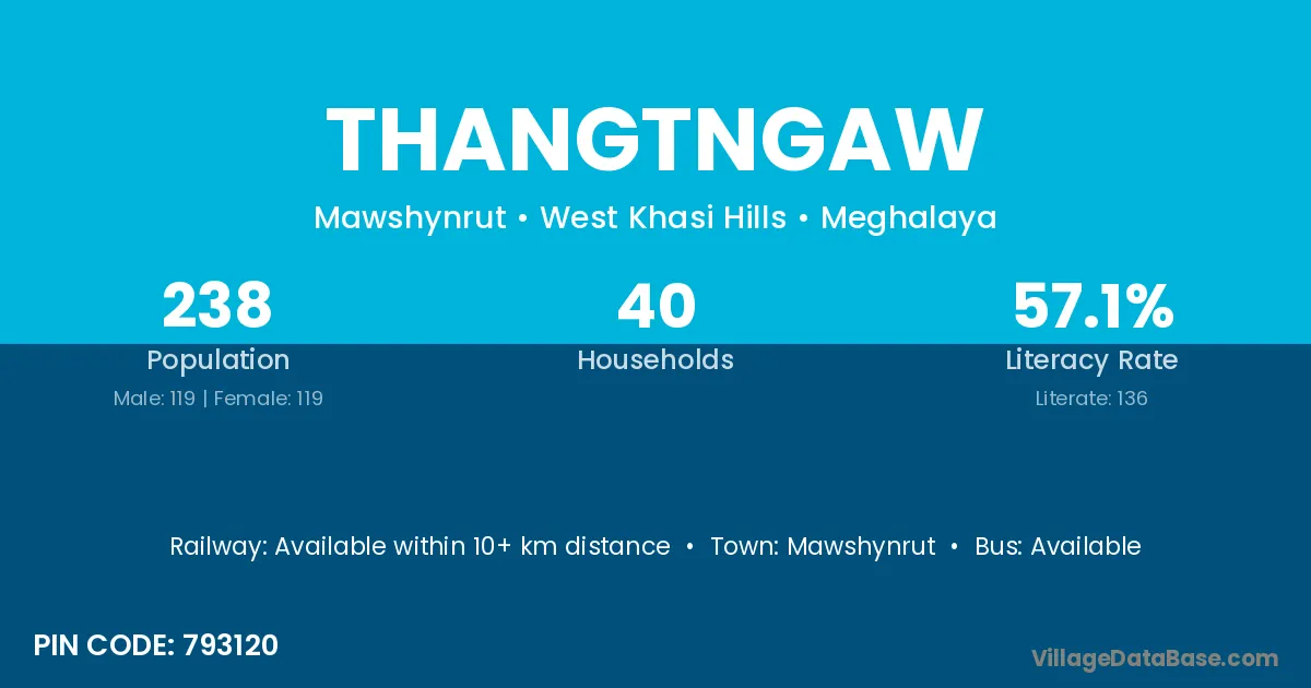 Thangtngaw village has a total population of 238 people, of which 119 are males and 119 are females.