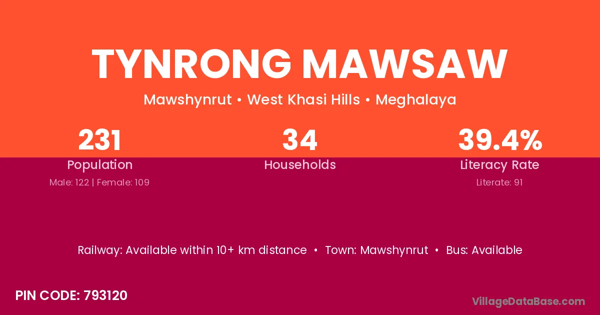 Tynrong Mawsaw village has a total population of 231 people, of which 122 are males and 109 are females.