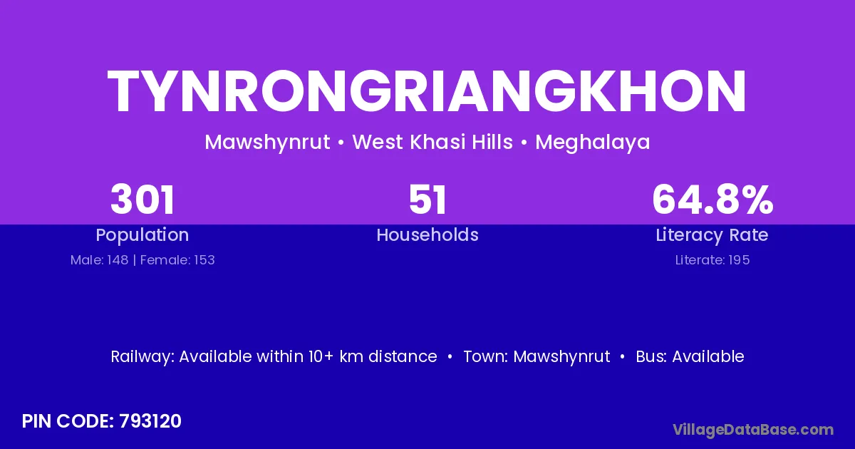 Tynrongriangkhon village has a total population of 301 people, of which 148 are males and 153 are females.