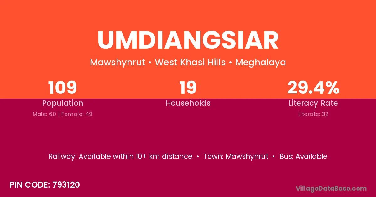 Umdiangsiar village has a total population of 109 people, of which 60 are males and 49 are females.