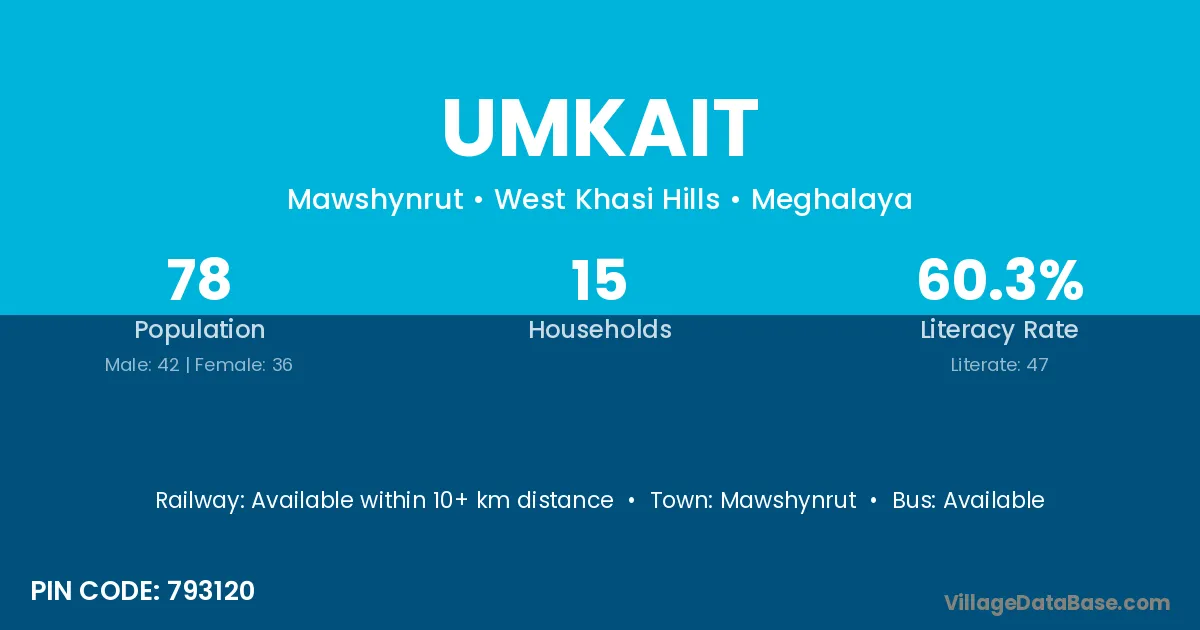 Umkait village has a total population of 78 people, of which 42 are males and 36 are females.