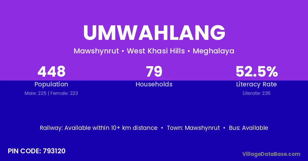 Umwahlang village has a total population of 448 people, of which 225 are males and 223 are females.