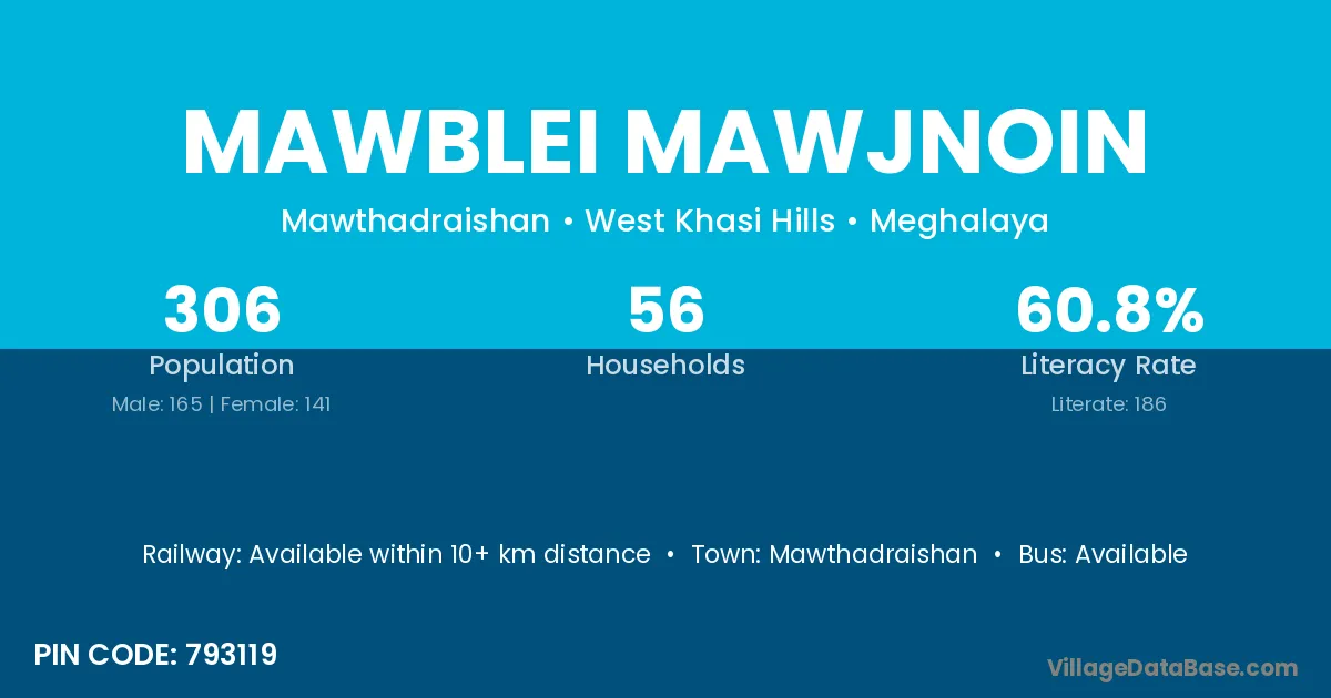 Mawblei Mawjnoin village has a total population of 306 people, of which 165 are males and 141 are females.