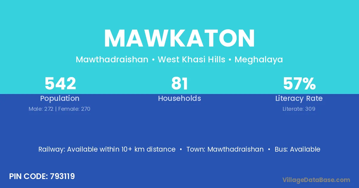 Mawthadraishan is the nearest town to Mawkaton village for major economic activities