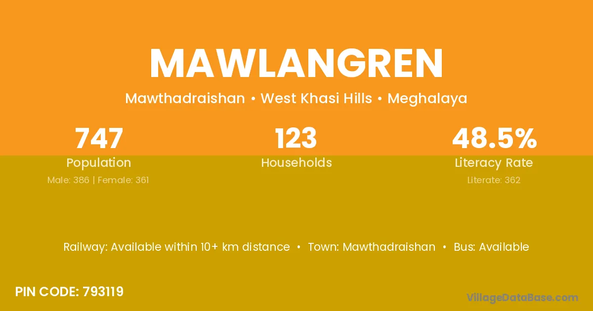 Mawlangren village has a total population of 747 people, of which 386 are males and 361 are females.