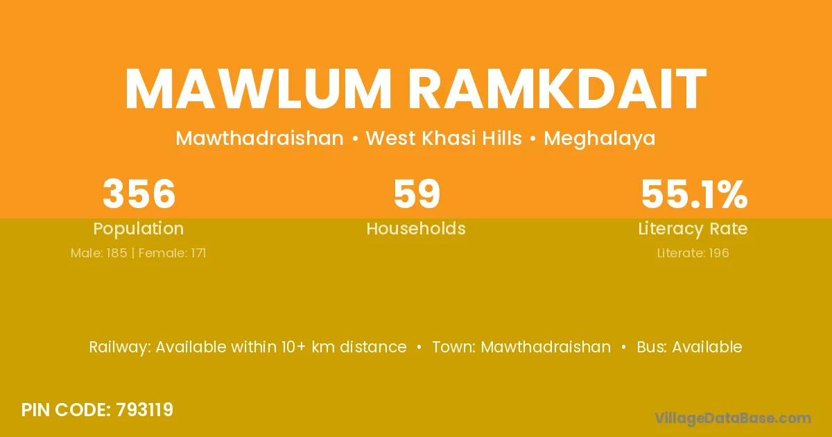 Mawthadraishan is the nearest town to Mawlum Ramkdait village for major economic activities