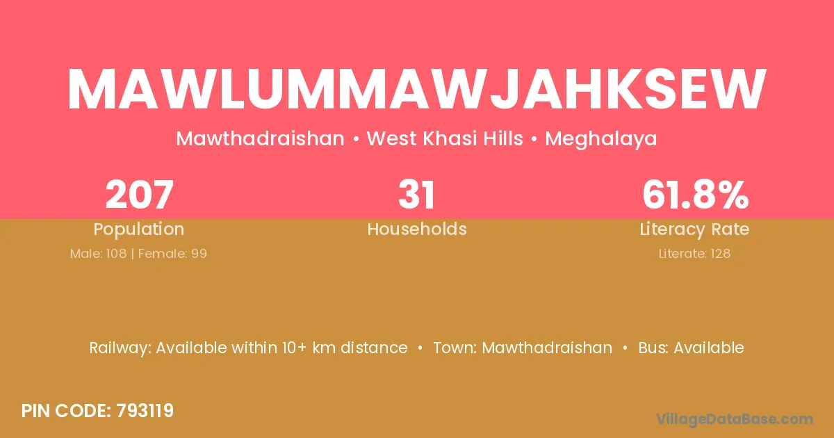 Mawlummawjahksew village has a total population of 207 people, of which 108 are males and 99 are females.