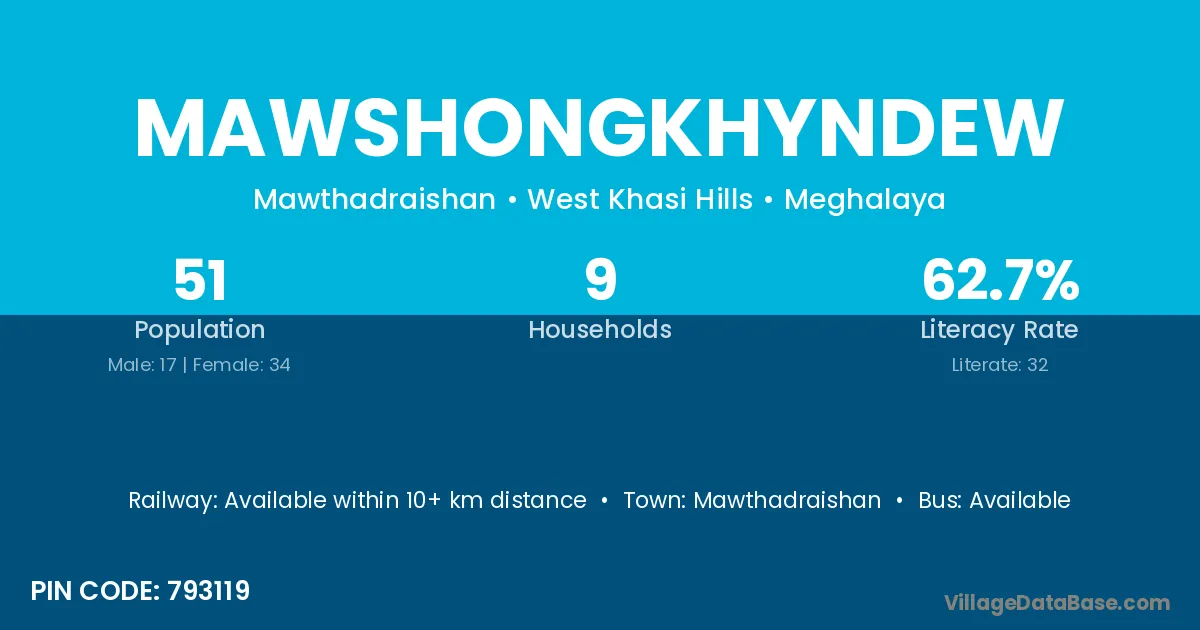 Mawshongkhyndew village has a total population of 51 people, of which 17 are males and 34 are females.