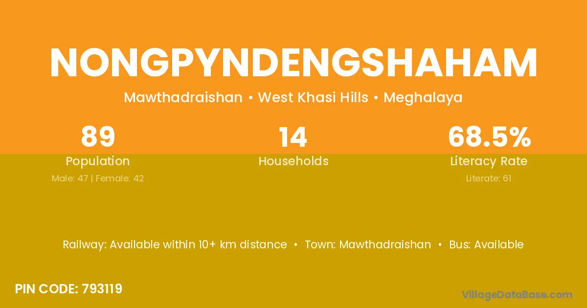 Nongpyndengshaham village has a total population of 89 people, of which 47 are males and 42 are females.