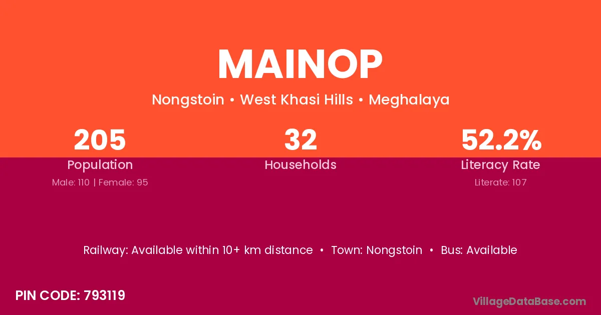 Mainop village has a total population of 205 people, of which 110 are males and 95 are females.