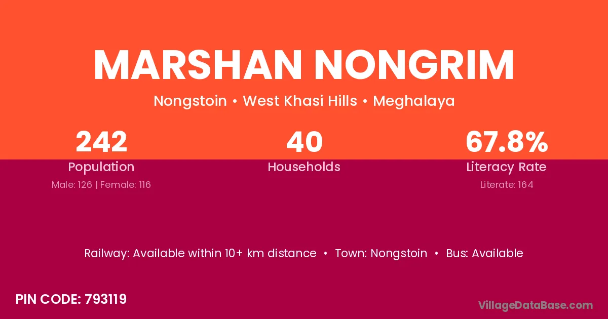 Marshan Nongrim village has a total population of 242 people, of which 126 are males and 116 are females.