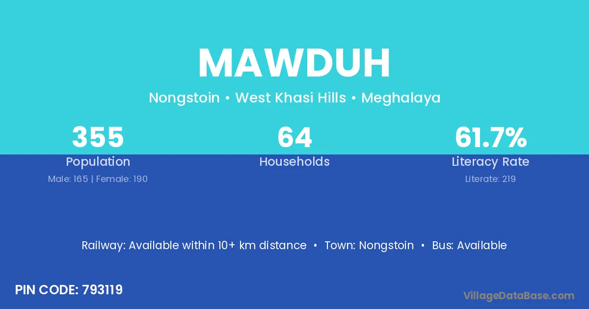 Mawduh village has a total population of 355 people, of which 165 are males and 190 are females.