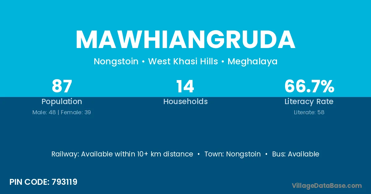 Mawhiangruda village has a total population of 87 people, of which 48 are males and 39 are females.