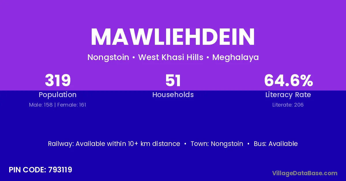 Mawliehdein village has a total population of 319 people, of which 158 are males and 161 are females.