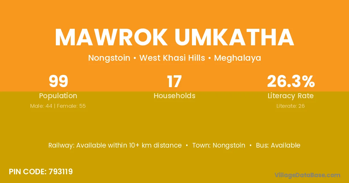Mawrok Umkatha village has a total population of 99 people, of which 44 are males and 55 are females.