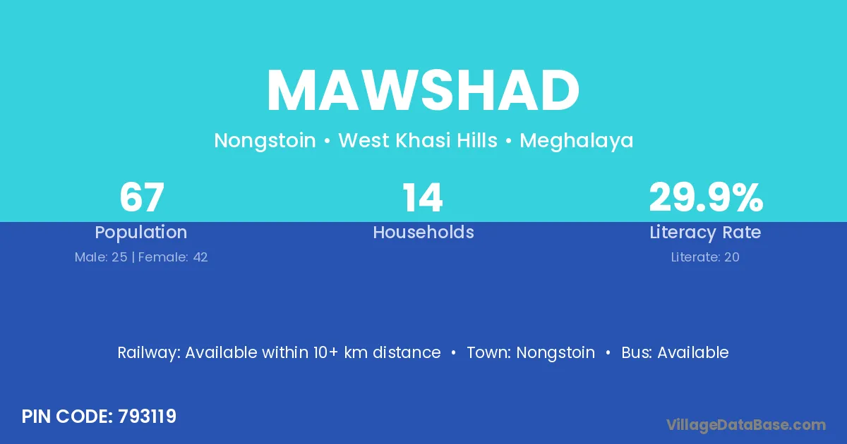 Mawshad village has a total population of 67 people, of which 25 are males and 42 are females.