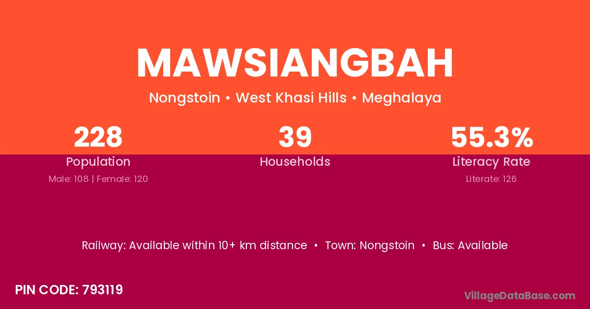 Mawsiangbah village has a total population of 228 people, of which 108 are males and 120 are females.