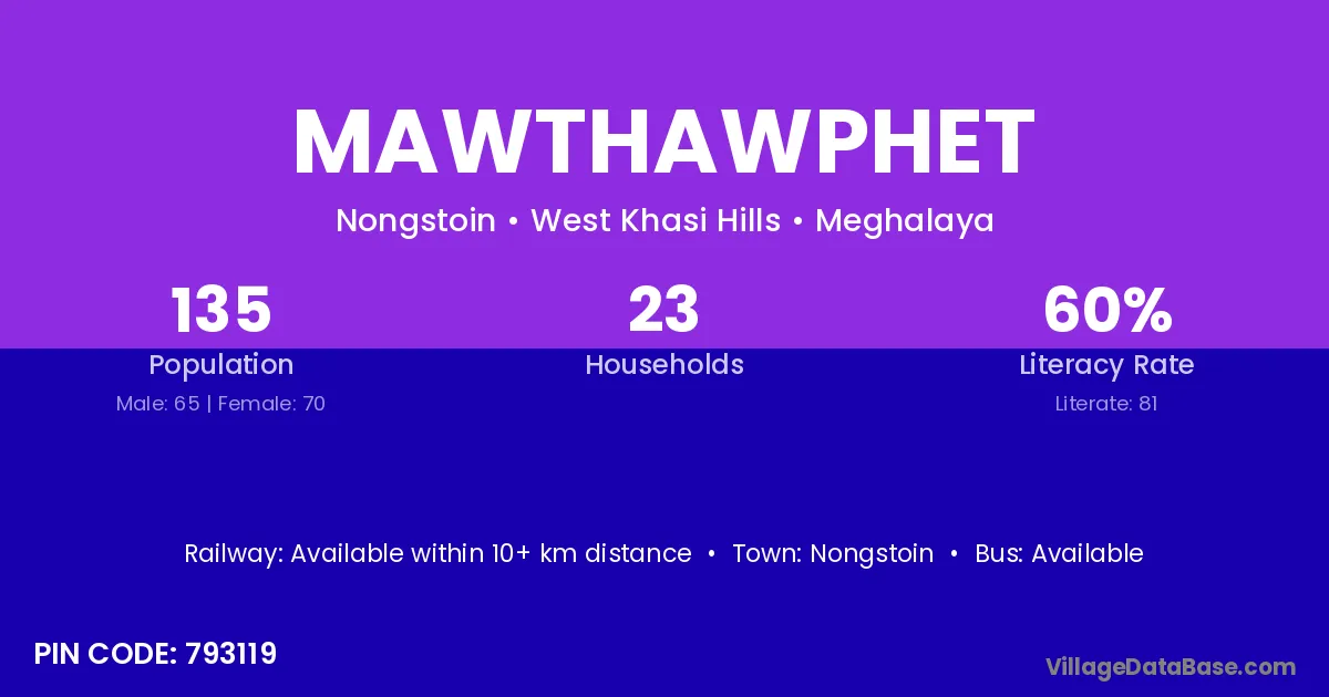 Mawthawphet village has a total population of 135 people, of which 65 are males and 70 are females.