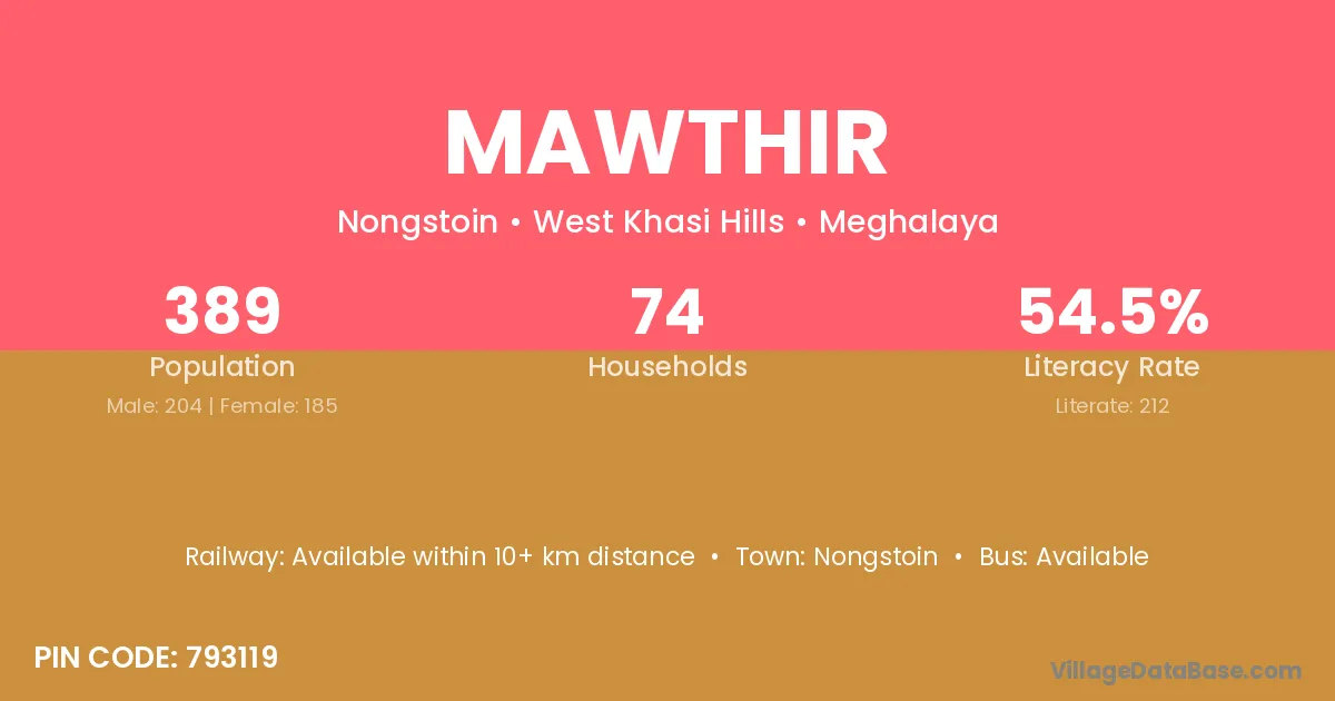 Mawthir village has a total population of 389 people, of which 204 are males and 185 are females.