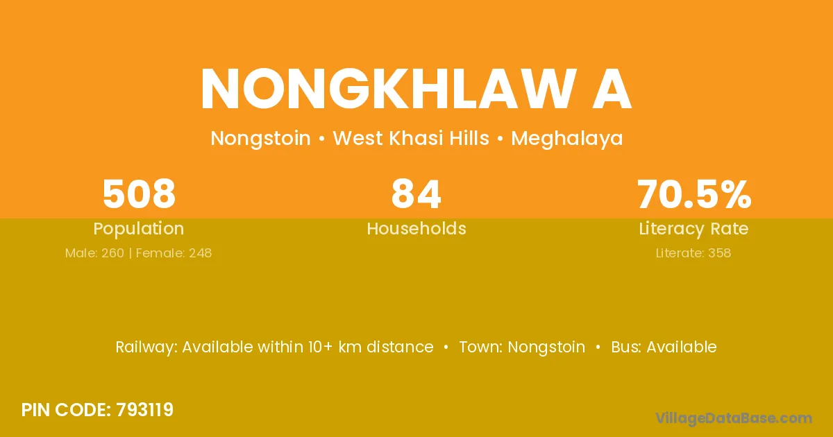 Nongkhlaw A village has a total population of 508 people, of which 260 are males and 248 are females.