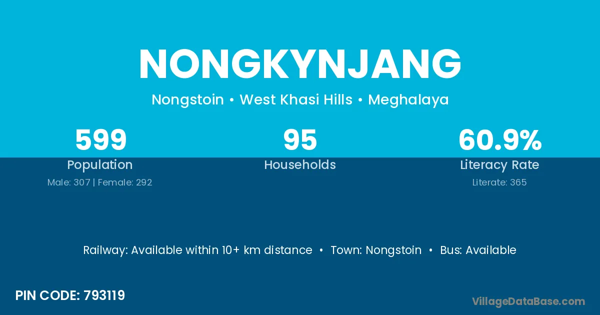 Nongkynjang village has a total population of 599 people, of which 307 are males and 292 are females.