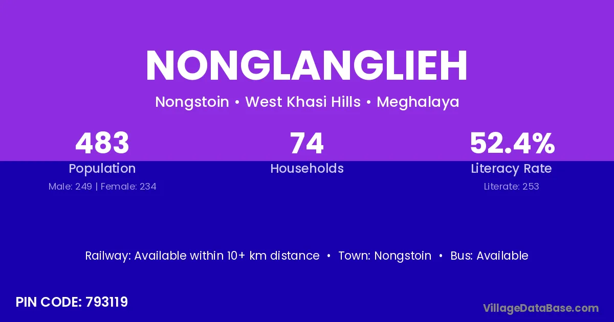 Nonglanglieh village has a total population of 483 people, of which 249 are males and 234 are females.