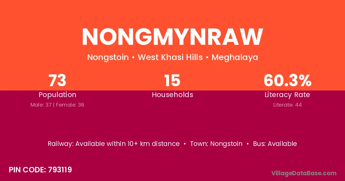 Nongmynraw village has a total population of 73 people, of which 37 are males and 36 are females.