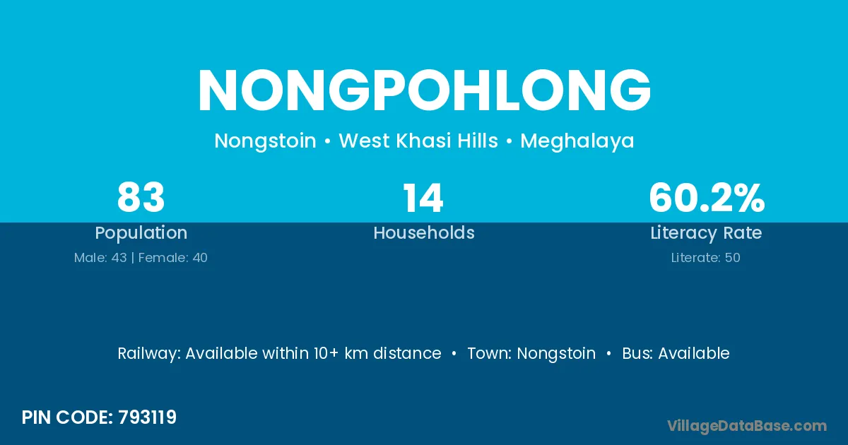 Nongpohlong village has a total population of 83 people, of which 43 are males and 40 are females.