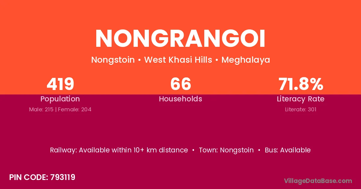Nongrangoi village has a total population of 419 people, of which 215 are males and 204 are females.