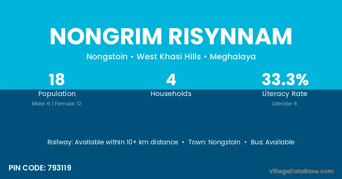 Nongrim Risynnam village has a total population of 18 people, of which 6 are males and 12 are females.