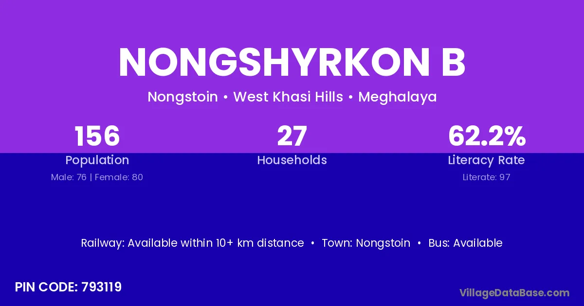 Nongshyrkon B village has a total population of 156 people, of which 76 are males and 80 are females.